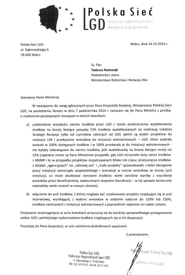 Pismo Polskiej Sieci LGD do Pana Ministra Tadeusza Nalewajka