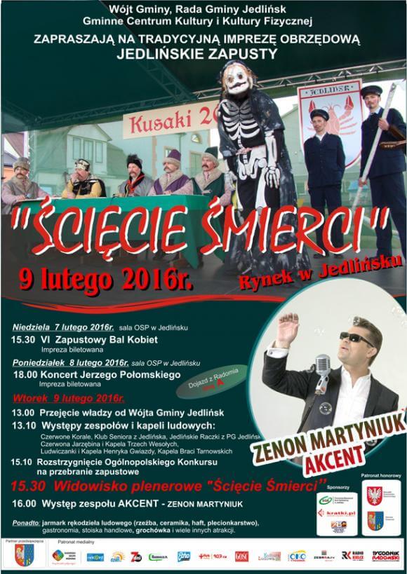 Gminne Centrum Kultury i Kultury Fizycznej w Jedlińsku jest organizatorem wydarzenia kończącego karnawał w Jedlińsku, tzw. Jedlińskie Zapusty. Elementem tego wydarzenia będzie widowisko plenerowe: Ścięcie Śmierci, które jest jedynym tego typu wydarzeniem kulturalnym w Polsce i Europie. Swoim rodowodem sięga ono XVI stulecia i jest nadal kultywowane w Jedlińsku na pamiątkę „prawa miecza”, które Jedlińsk otrzymał przy lokacji miasta w 1530 roku. Badacze twierdzą, że na obrzęd „Ścięcia Śmierci” duży wpływ miała szkoła ariańska istniejąca w Jedlińsku w latach 1560- 1630 oraz szkoła wyższa funkcjonująca w latach 1630- 1655. W ówczesnych czasach w Jedlińsku przebywało bowiem wielu kleryków, historyków i żaków. Widowisko mogło wziąć swój początek od igrzyska żakowskiego, tj. ścięcia kukły symbolizującej śmierć. Widowisko zachowało swoją pierwotną formę, poprzez co stanowi ważny element dziedzictwa kulturowego naszego kraju. Należy zaznaczyć, że wszystkie role (nawet kobiece) w widowisku są odtwarzane przez mężczyzn.