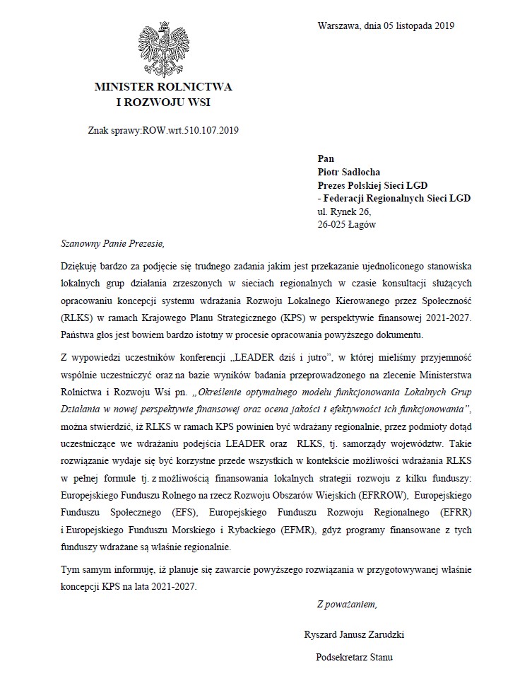 Pismo Ministra Rolnictwa i Rozwoju Wsi