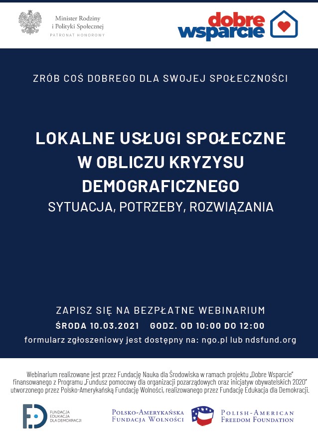 Serdecznie zapraszamy na bezpłatny webinar pt.: „Lokalne usługi społeczne w obliczu kryzysu demograficznego sytuacja, potrzeby, rozwiązania”, poświęcony tematyce społecznych usług opiekuńczych oraz procesów budowania lokalnych sieci pomocy wzajemnej.