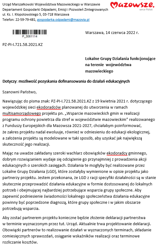 Pismo w sprawie możliwości pozyskania dofinansowania do działań edukacyjnych