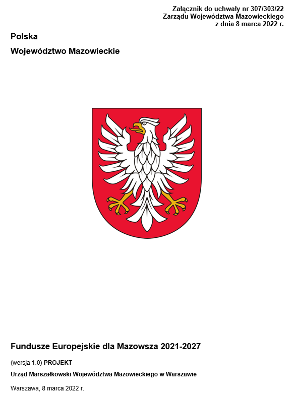 Zarząd Województwa Mazowieckiego uchwałą nr 307/303/22 z dnia 8 marca 2022 r. przyjął projekt programu regionalnego Fundusze Europejskie dla Mazowsza 2021-2027 (wersja 1.0). 15 marca br. projekt programu wraz z Prognozą oddziaływania na środowisko projektu FEM 2021-2027 oraz Analizą DNSH został za pośrednictwem systemu SFC przekazany do Komisji Europejskiej.