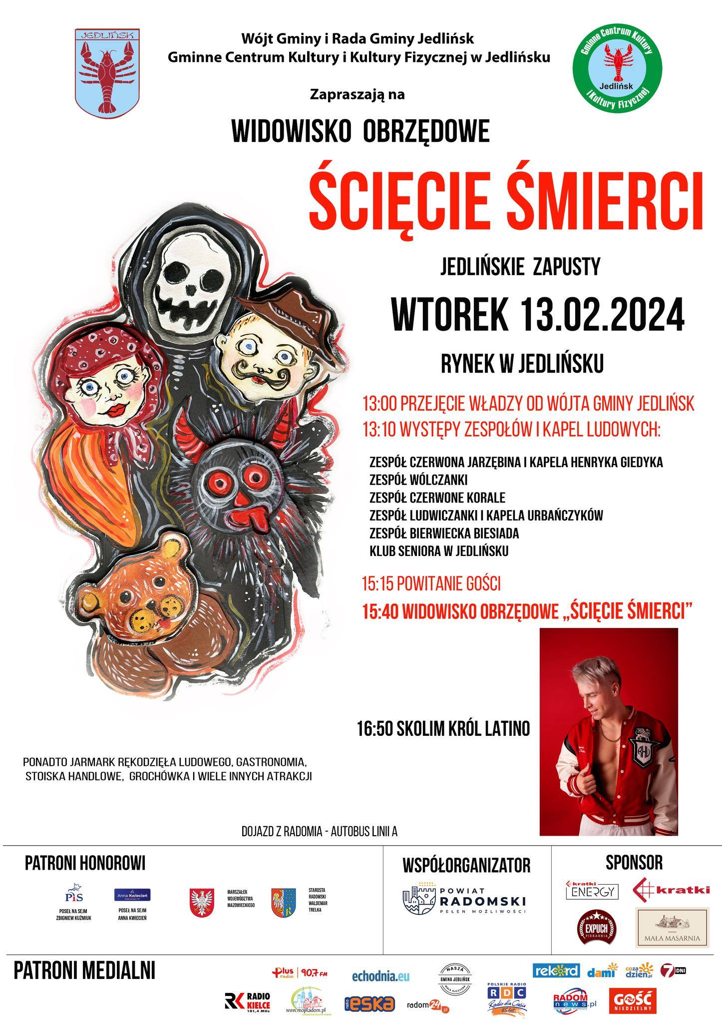 Wójt gminy Jedlińsk zaprasza wszystkich na widowisko obrzędowe Ścięcie Śmierci odbywające się w ramach Jedlińskich Zapustów 13 lutego 2024 roku godz.15.15