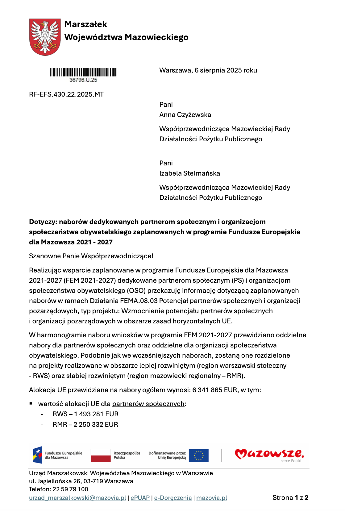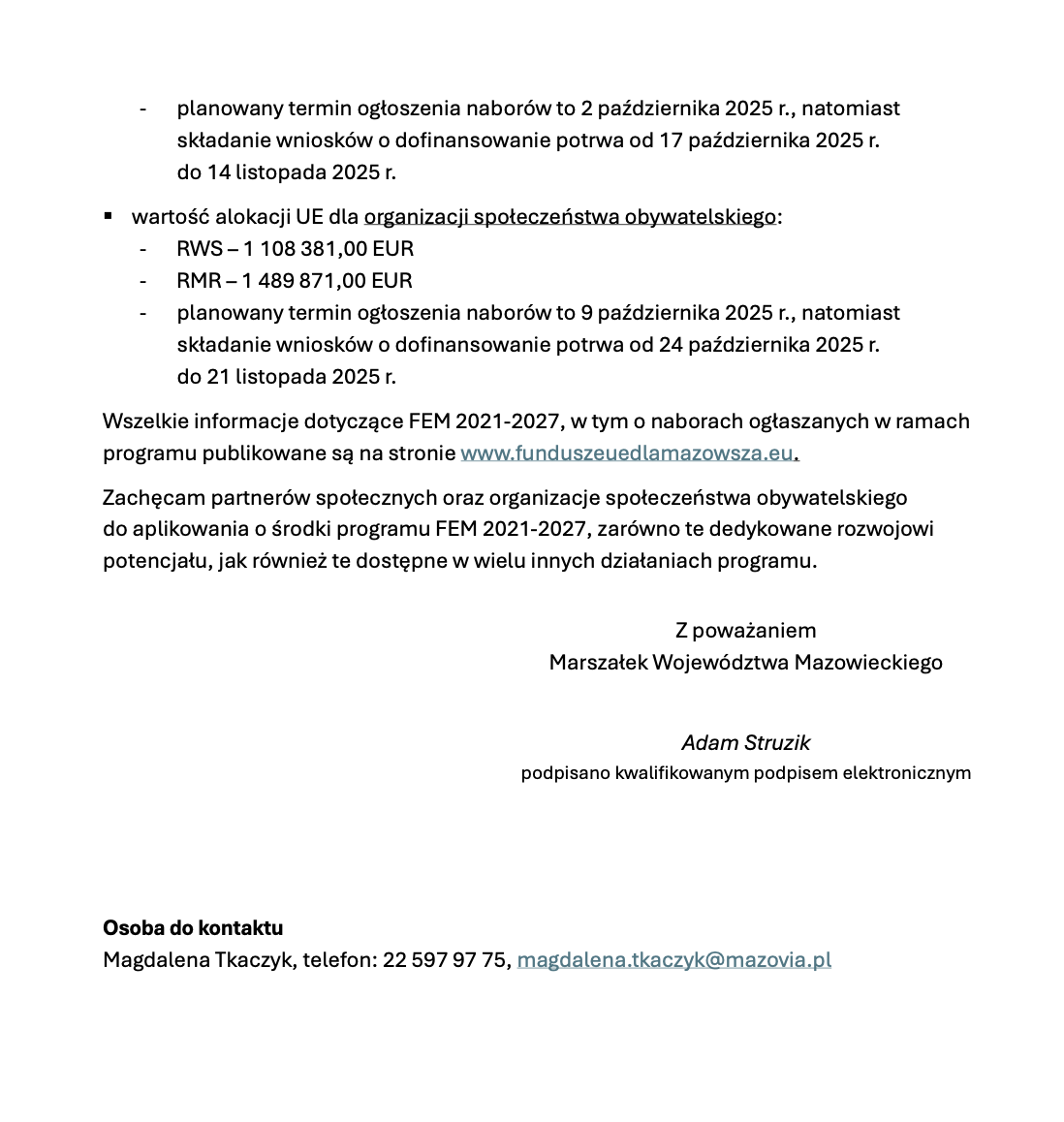 Nabor wniosków na dofinansowanie z Programu Fundusze Europejskie dla Mazowsza 2021–2027 projektów w ramach Działania FEMA.08.03 Potencjał partnerów społecznych i organizacji pozarządowych, typ projektu: Wzmocnienie potencjału partnerów społecznych i organizacji pozarządowych w obszarze zasad horyzontalnych UE.